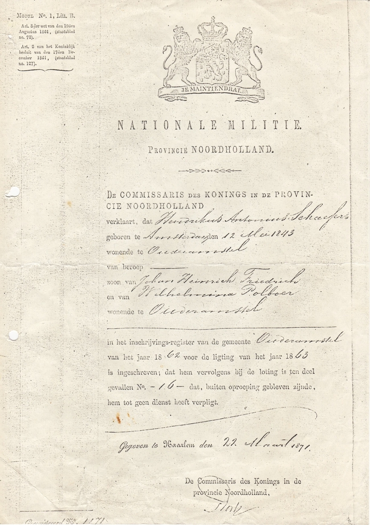 beroep Groenboersknecht, zoon van Anton Schaefers en van Theresia Borgholt, wonende te Amsterdam voor de Nationale Militie na de loting is ingeschreven, en voorts tot ongehoudenheid aan de Nationale