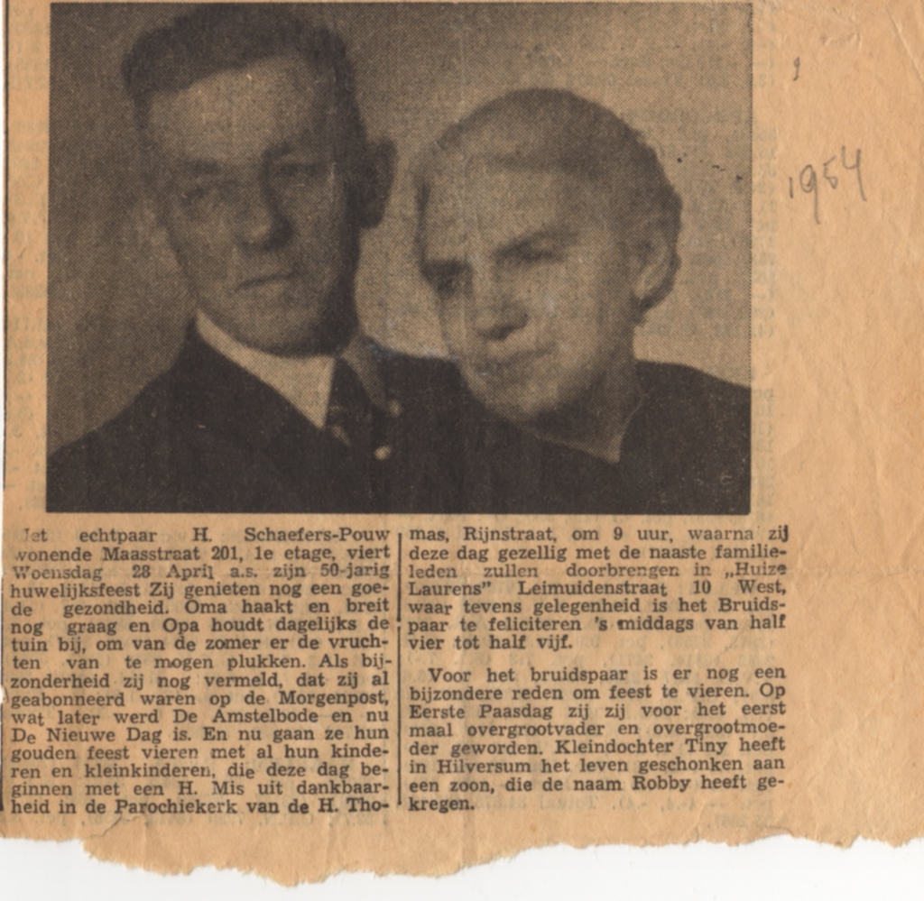Aankondiging 50 jarige huwelijk 1954 Hendrikus Gerardus Schaefers en Cornelia Gerarda Pouw
