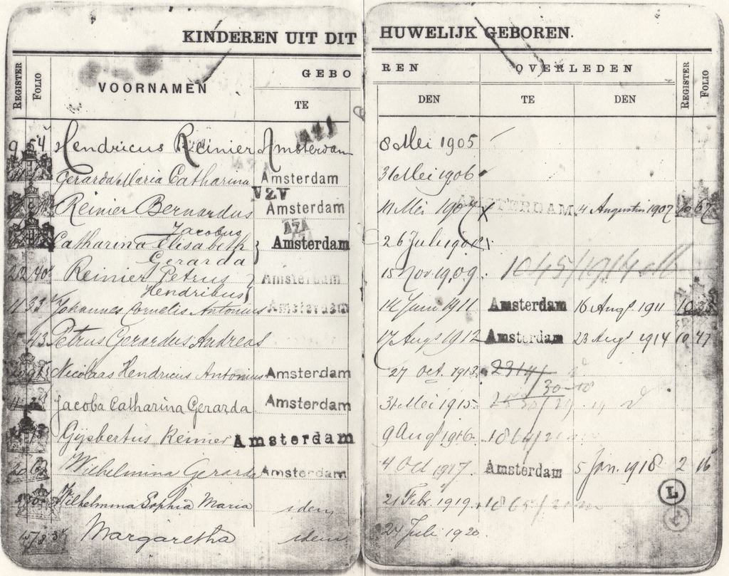 3. Reinier Bernardus SCHAEFERS (IX.3.5.3)* 10-05-1907 Amsterdam; Reinier is overleden op 14-08-1907 in Amsterdam, 3 maanden oud.