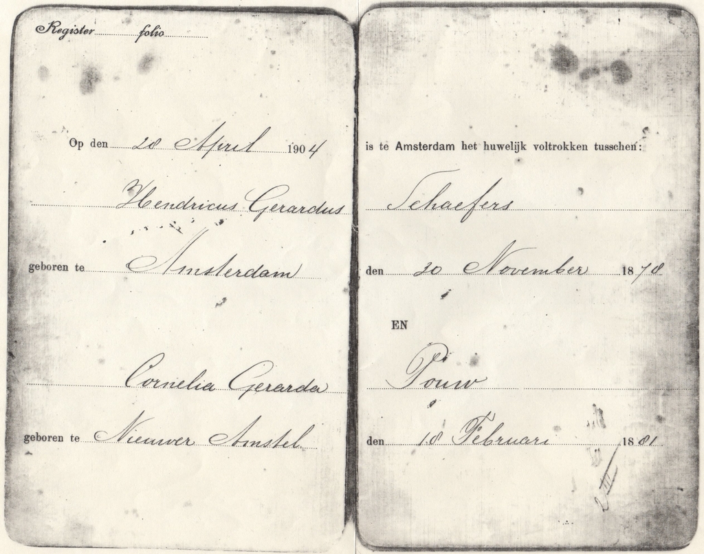 6. Maria SCHAEFERS (VII.6) * 12-09-1848 Amsterdam, x 29-01-1870 Ouder-Amstel met Simon Jacobus HOFMAN, * 20-08-1837
